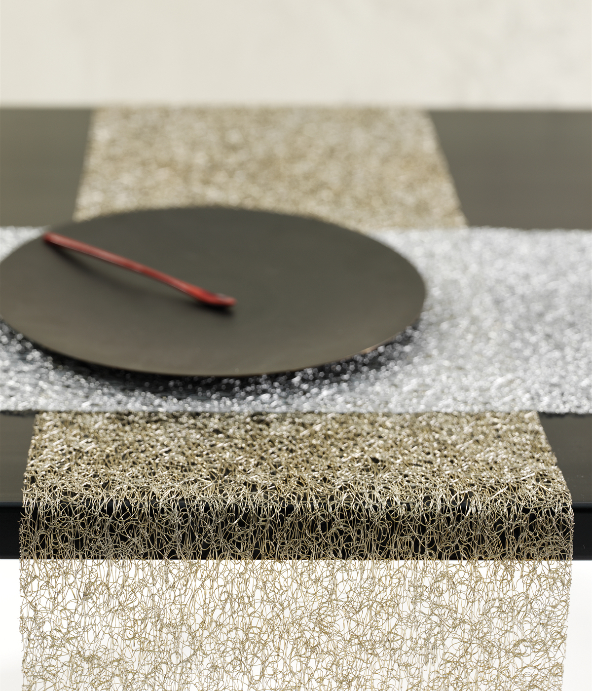 At first glance Metallic Lace appears tobe real metal, however upon closer inspection it is clearly a verysophisticated and refined textile. The open abstract netting is 'metalized' toform the metallic looking surface and thus becomes a truly contemporary lace inboth placemats and runners.