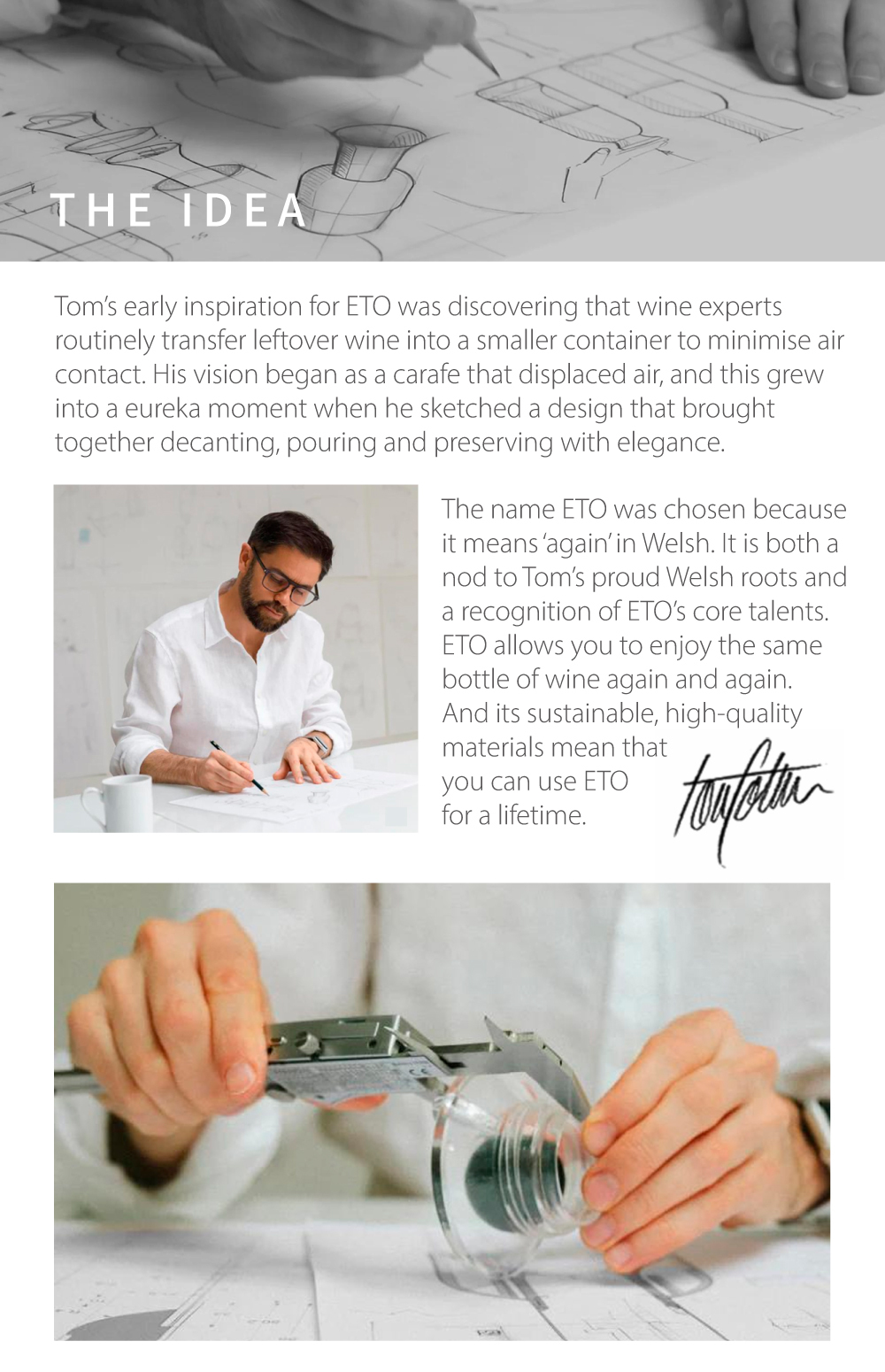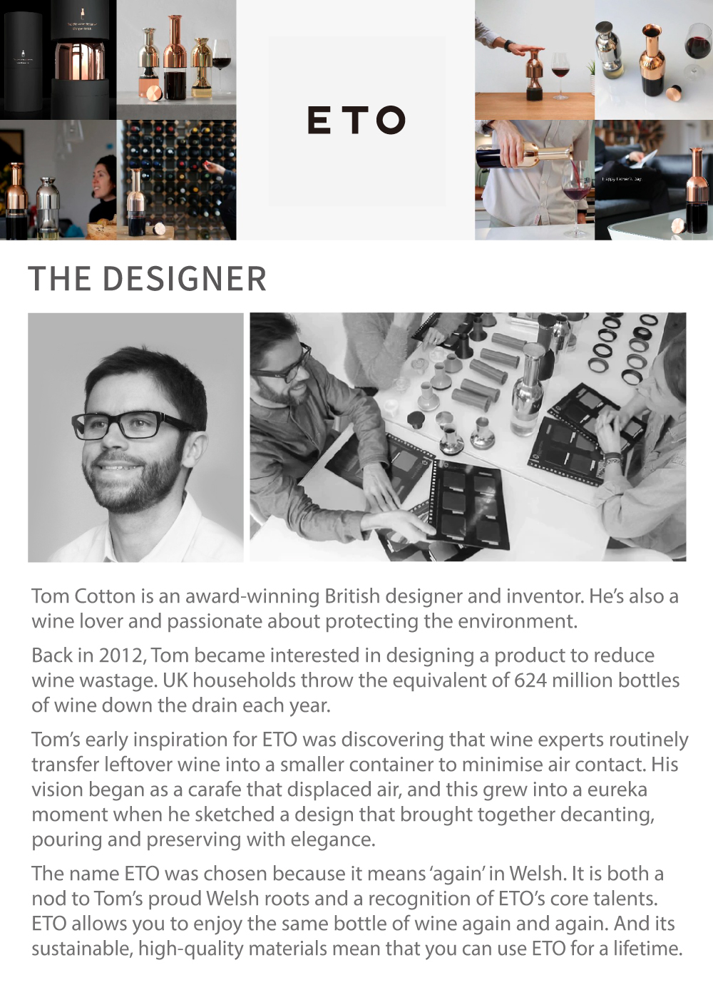Eto’s patented design slows oxidation and keeps wine fresh. Once opened, wine quickly loses its flavor when exposed to air. Driven by this problem, Welsh designer Tom Cotton created eto, an elegant solution that could combine decanting, serve, and preserving in one.