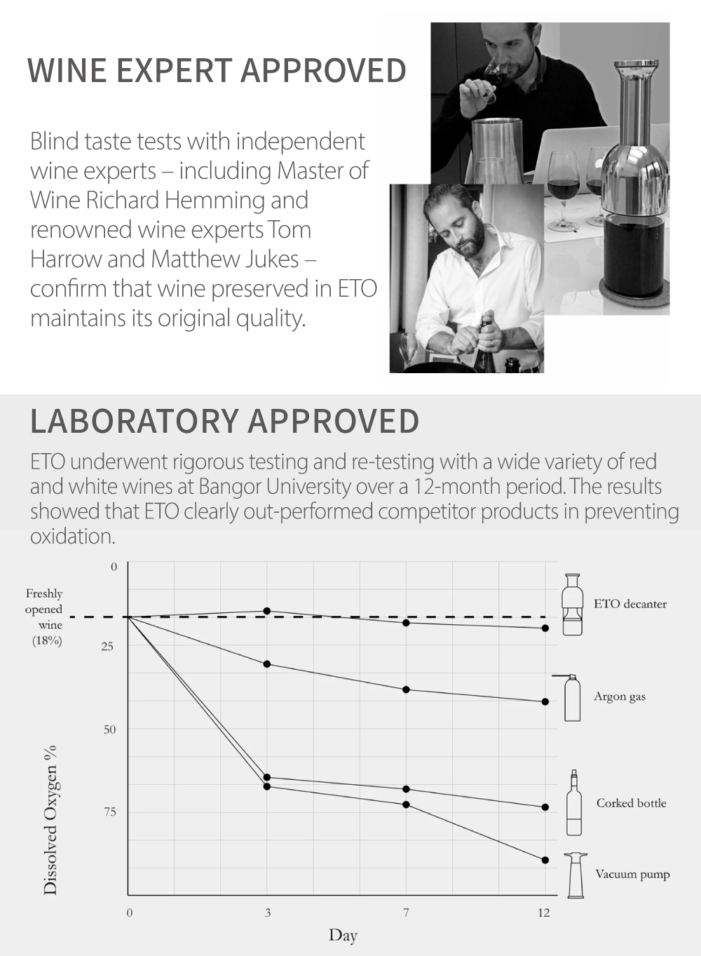 ETO is a beautiful, award-winning decanter that effectively preserves your wine. Its airtight seal and fridge friendly design means that you can protect your opened bottle from all three of wine’s enemies – oxygen, light and heat.