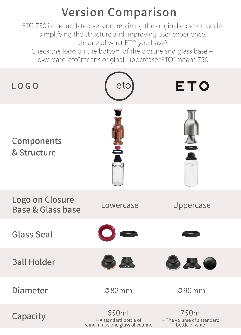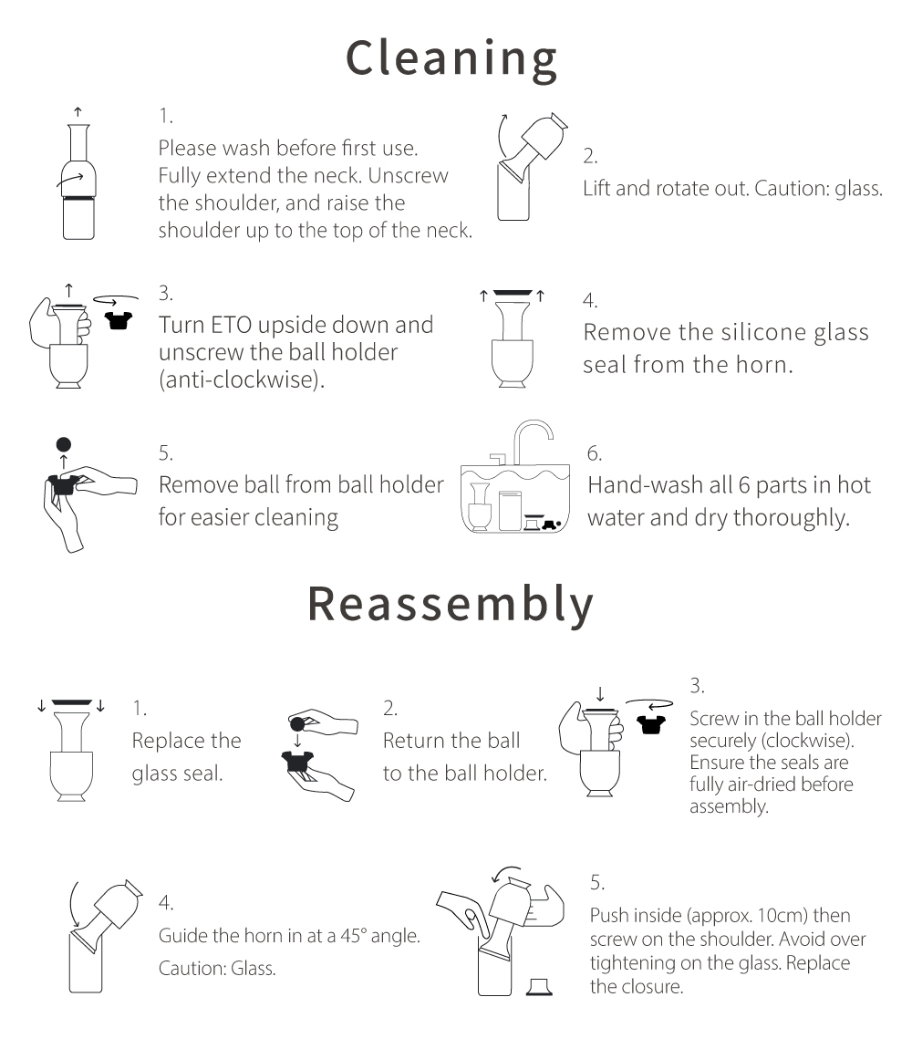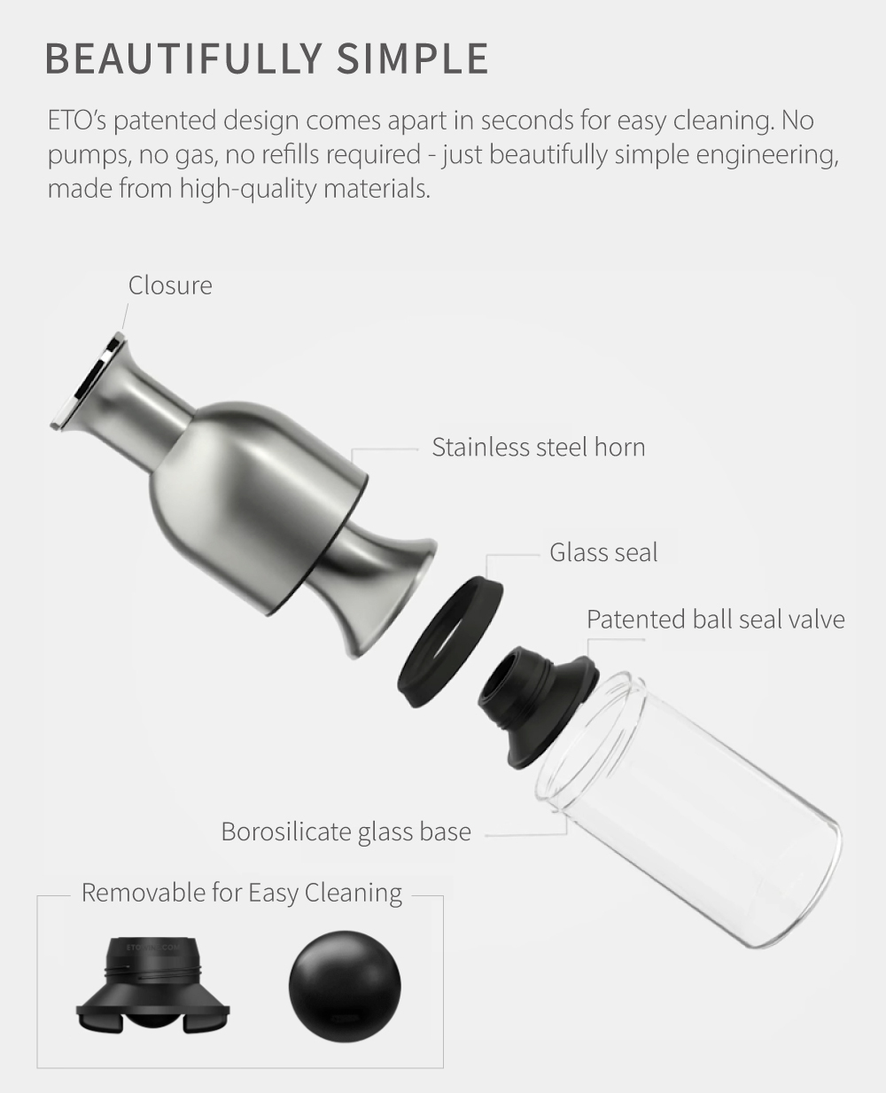 With just a simple press, eto seals the bottle and prevents spoilage. Pour the wine into eto – its rolling ball structure helps aerate the wine, releasing aroma and flavor. When you’re done, place the cap back on and push the neck down to the level of the remaining wine. Air is automatically expelled, creating a seal that keeps the wine fresh for up to 7 days. When you’re ready to drink again, simply lift the neck to reopen and enjoy freshly aerated wine.