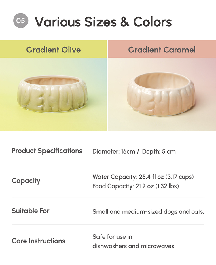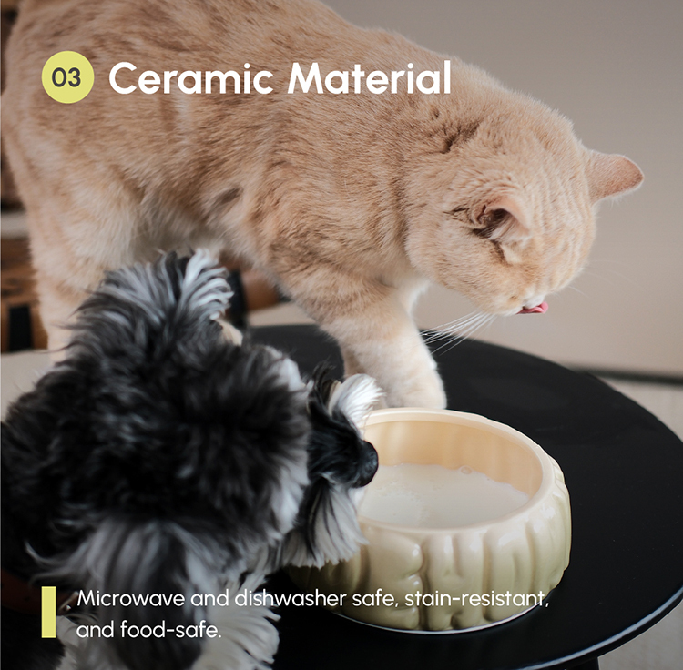High-fired ceramic pet bowl with inward-curved rim to reduce splashes and keep mealtime tidy. Seamless rounded design is easy to clean, with a wide, stable base to prevent tipping. Certified food-safe in the U.S., microwave and dishwasher safe.