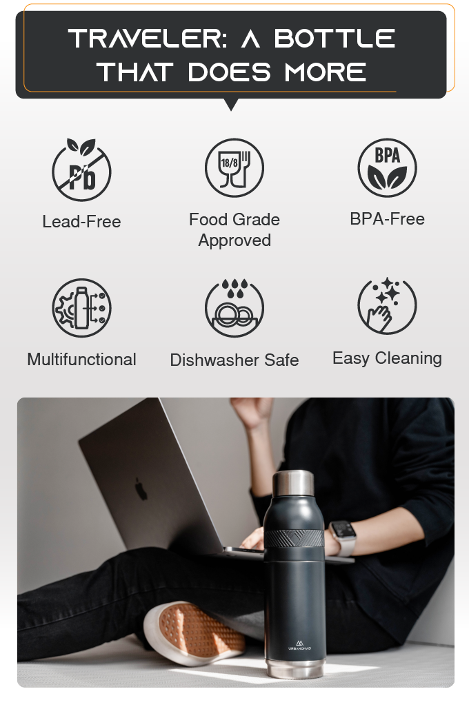 TRAVELER bottle is LEAD-FREE and BPA-FREE , showcasing our commitment to both your health and environmental sustainability. We ensure the highest safety and eco-friendliness, absorbing higher costs to guarantee no harm to you or the planet.