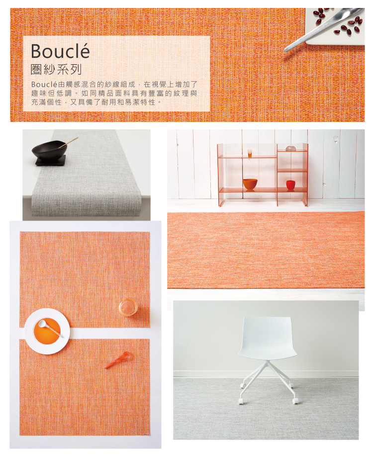 Bouclé 由觸感混合的紗線組成,是一種縐紗編織物,在視覺上增加了趣味但低調。如同精品面料具有豐富的紋理與充滿個性,同時具備了chilewich所有產品的耐用和好清潔的特性。