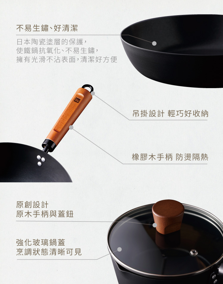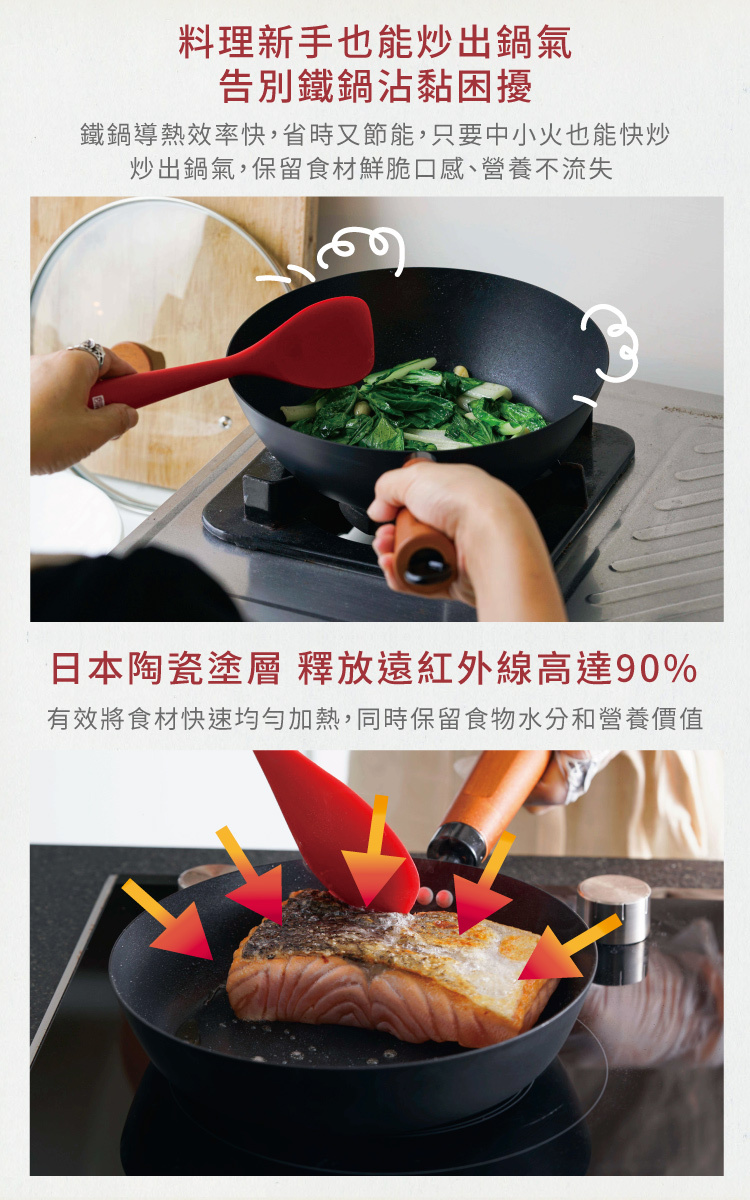 100%台灣製造,結合日本okitsumo陶瓷不沾塗層,省油、不沾、好清潔,導熱快且均勻,省時又節能。
