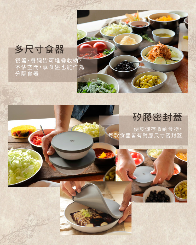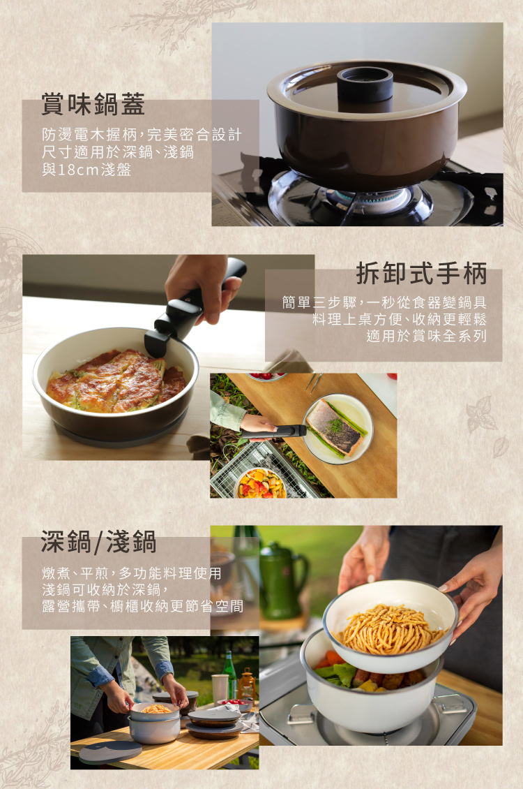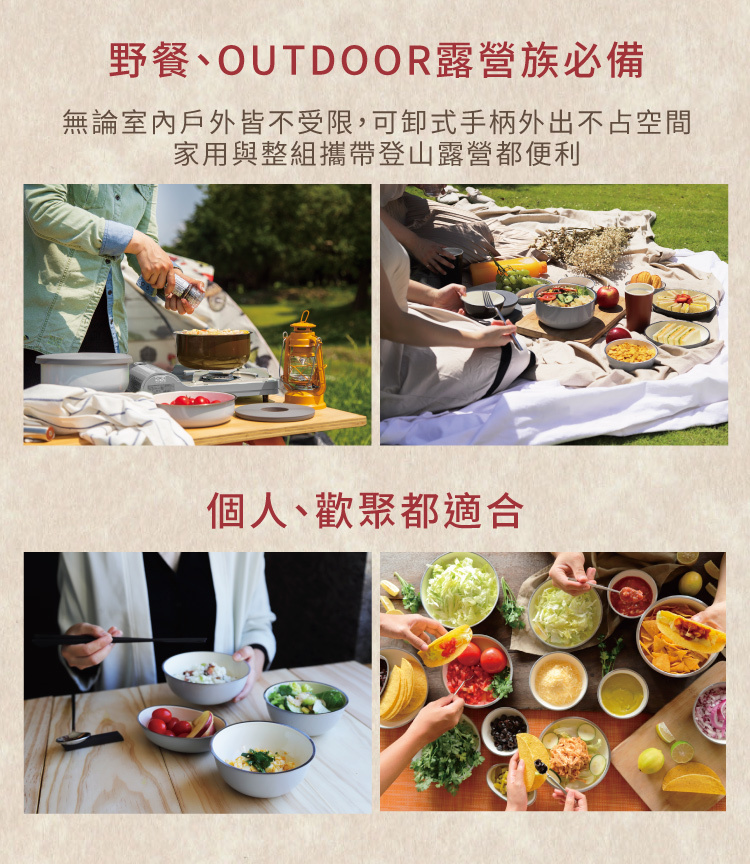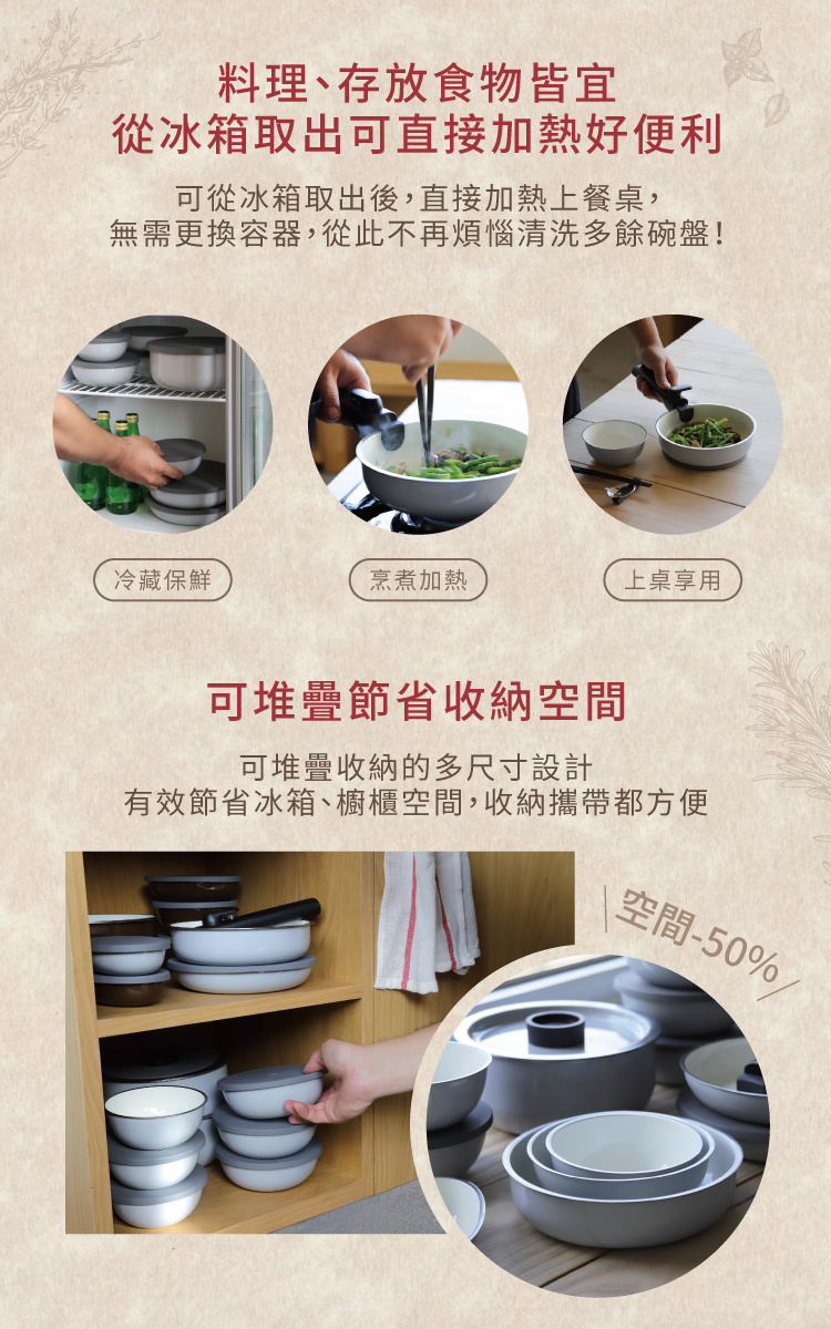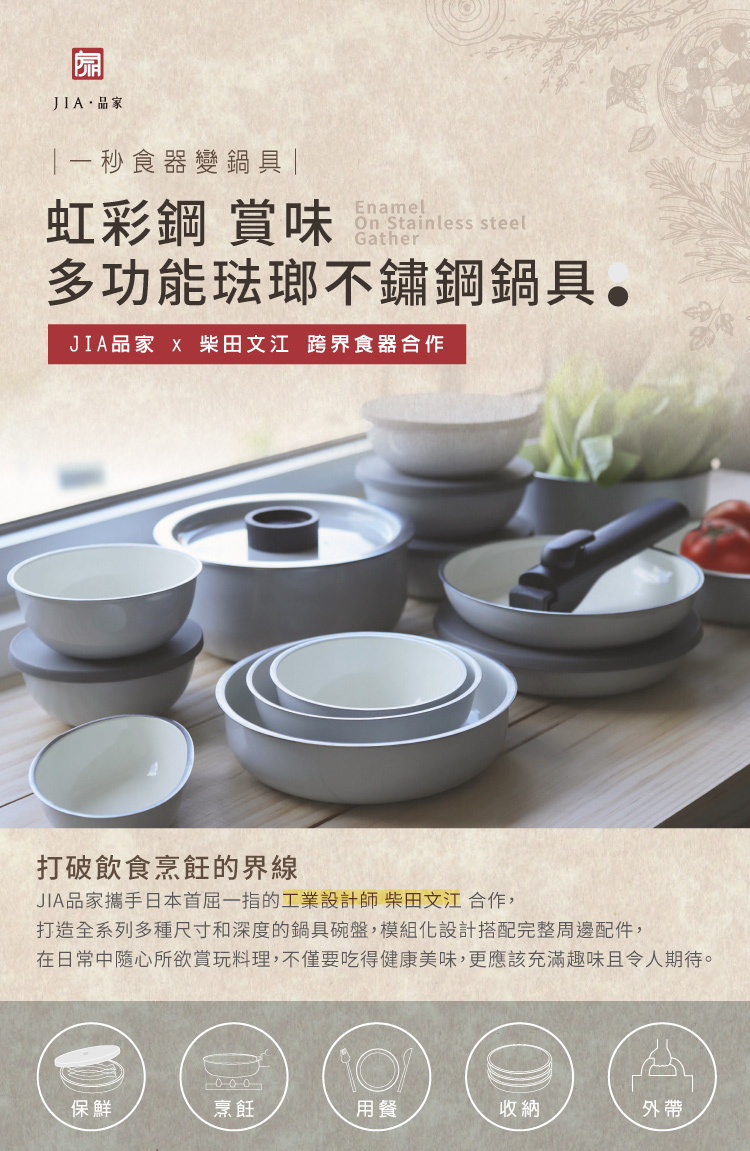 跨界食器,全系列多種尺寸和深度的鍋具碗盤,模組化設計搭配完整周邊配件,讓使用者不再受飲食烹飪的器具和環境限制,料理和用餐更多了靈活趣味和自主性! 簡約柔美的器型, 質感溫潤的琺瑯,呈現如周末般令人輕鬆愉悅的餐桌風景。