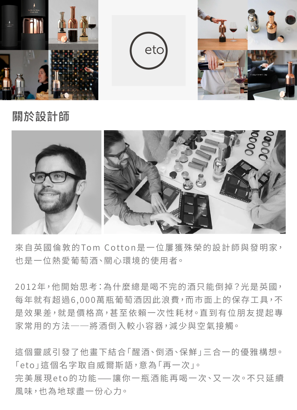 當您開啟一瓶葡萄酒後,空氣中的氧氣會開始氧化酒液,隨著時間推移,這會使葡萄酒變質。而 eto 的獨特專利保鮮系統能在酒與空氣之間形成密封,減少葡萄酒與氧氣的接觸,延緩氧化過程,有效保護葡萄酒的品質,讓它保存得更久。