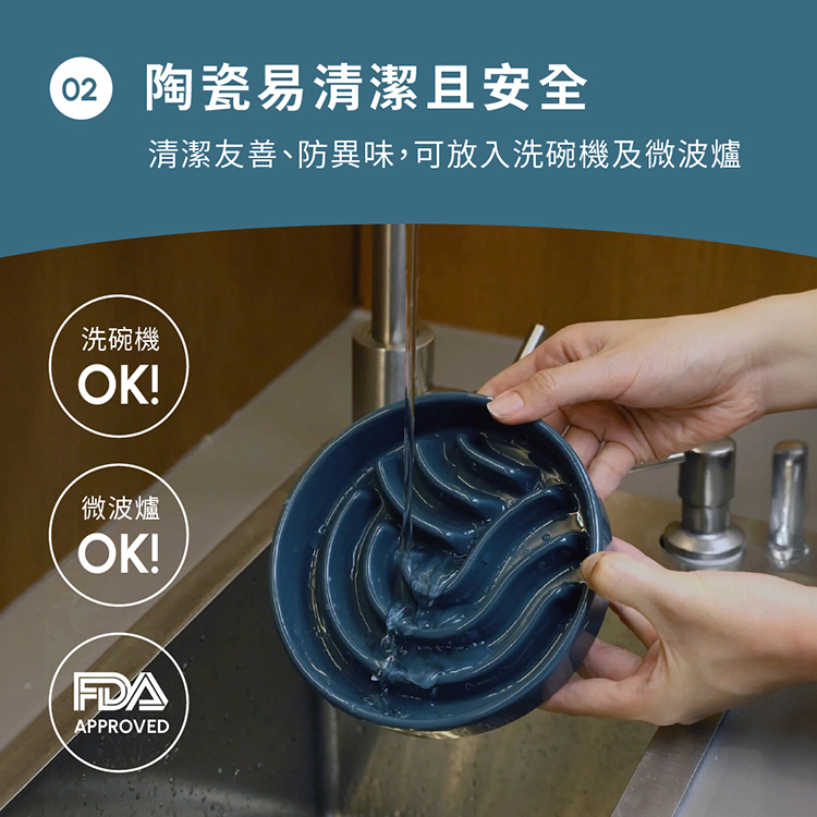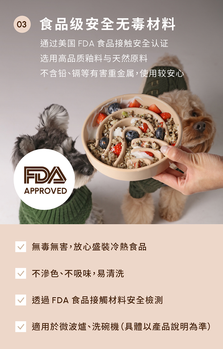 結合引導緩慢進食的結構設計,穩重安全、容易清潔的陶瓷材質,幫助毛孩細嚼慢嚥,讓每一餐都吃得舒適又安心。產品通過美國食品安全認證,可放入洗碗機及微波爐。