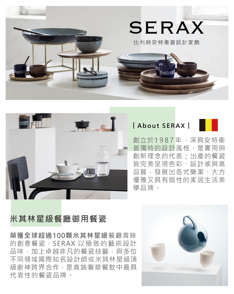 榮獲全球超過100顆米其林星級餐廳青睞的創意餐瓷,SERAX以極致的藝術和設計品味,卓越非凡的餐瓷技藝,與超過20位國際知名設計師或米其林星級頂級廚神跨界合作, 是高端奢華餐飲中最具代表性的餐瓷品牌。在比利時、荷蘭、義大利、法國、德國、西班牙等國皆有銷售據點。