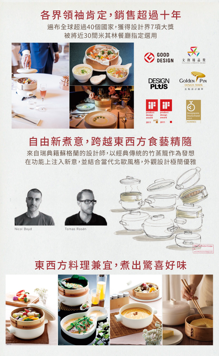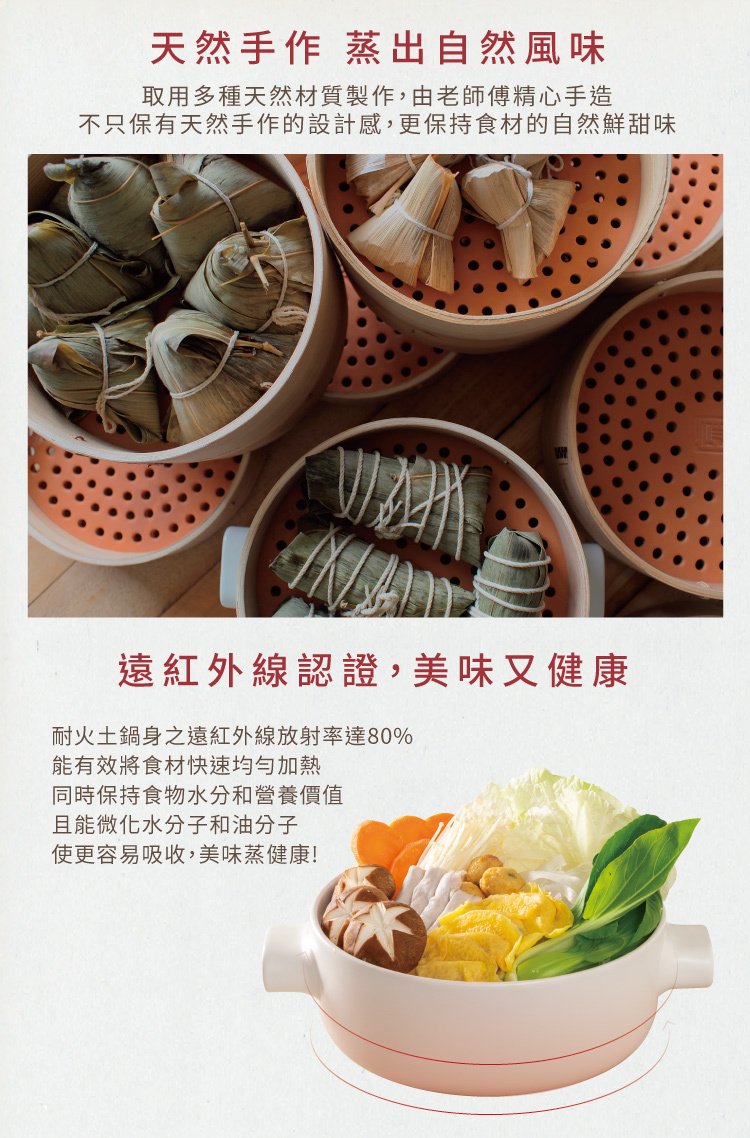 手工製成的柳杉木蒸籠,以赤陶代替一般全竹的蒸籠底盤。透氣吸水的赤陶材質,使蒸煮的食材不會有過多水氣殘留,避免食材過度濕軟。優質耐火土製成的蒸鍋鍋身對溫度變化有卓越的耐受性,打破一般陶瓷無法直火加熱的限制。