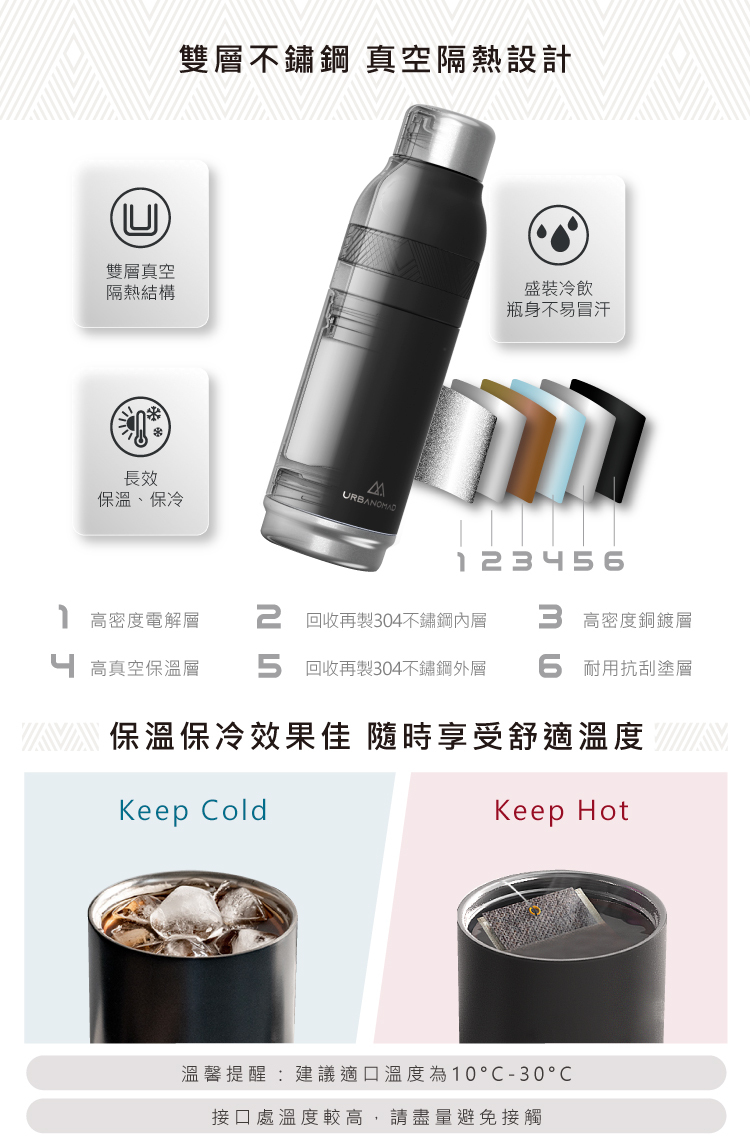瓶身可旋開設計,下半身立即化為隨行杯,加蓋防漏,隨時飲用長效保溫、保冷的飲品;