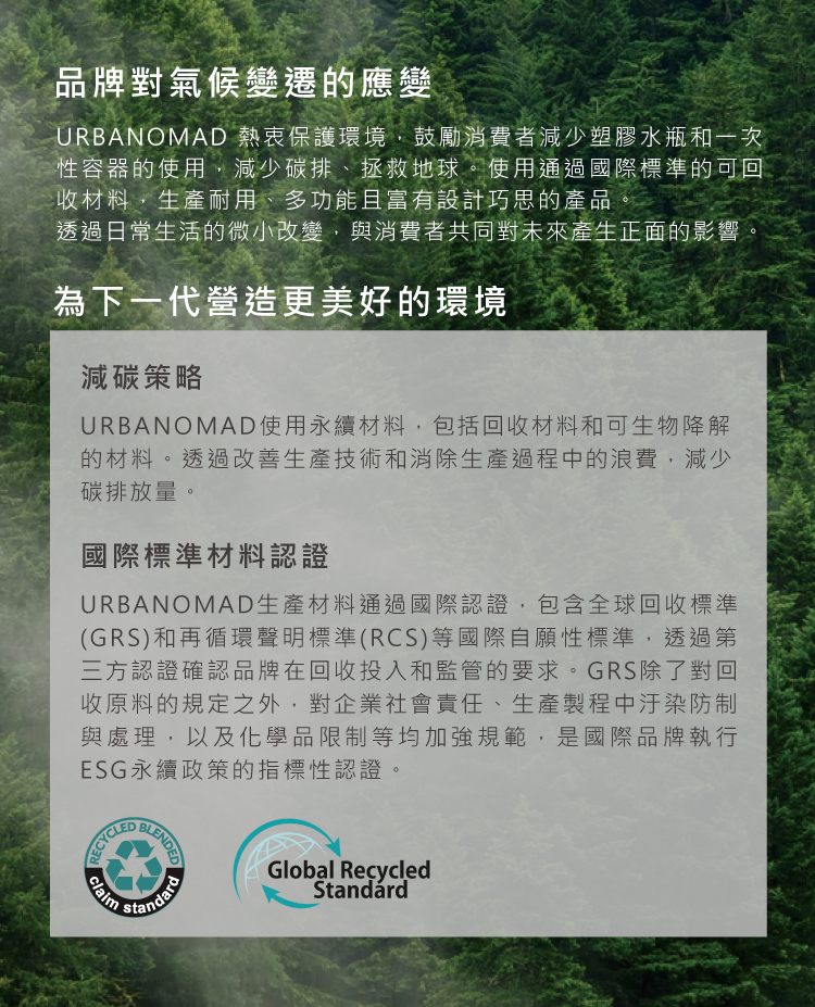 全面使用減碳環保、可循環回收的材質,創造屬於都會游牧民族的實用產品。享受生活時尚便利之外,也能沉浸在與大地合而為一的生活樂趣中。
