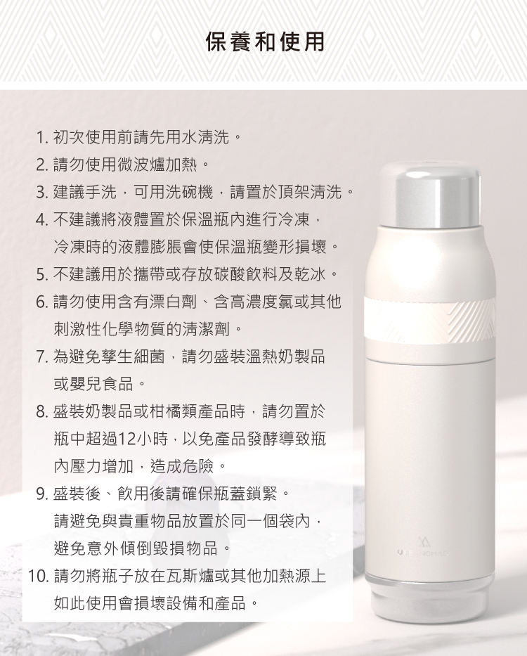 8. 當盛裝奶製品或柑橘類產品時,請勿置於瓶中超過12小時,以免產品發酵導致瓶內壓力增加,造成危險。