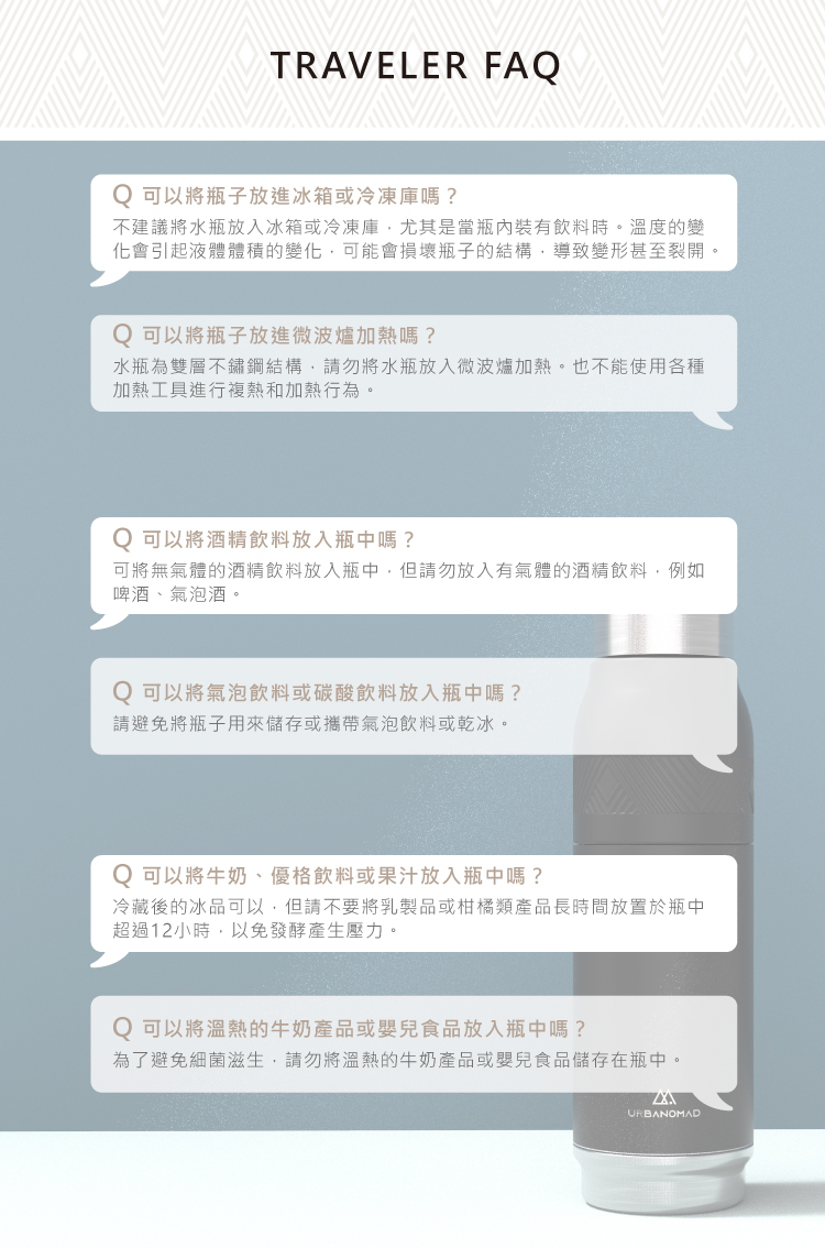 A4:請避免將瓶子用來儲存或攜帶氣泡飲料或乾冰。