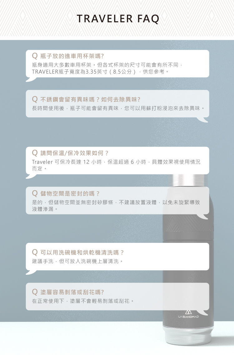A7:瓶身適用大多數車用杯架。但各式杯架的尺寸可能會有所不同,TRAVELER瓶子寬度為3.35英寸(8.5公分),供您參考。